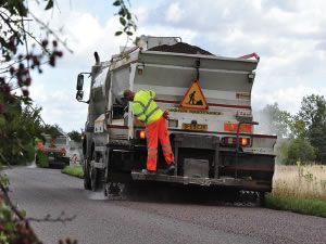 Ein heißer flüssiger Asphalt wird auf die Oberfläche gesprüht, gefolgt von einem Steinschnitt und einer Verdichtung.